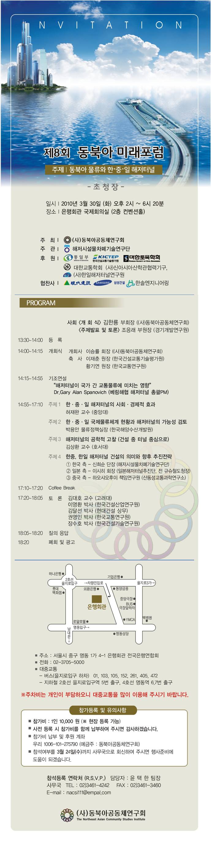 동북아 물류와 한중일해저터널이라는 주제로 다음과 같이 동북아미래포럼 행사를 개최하오니 부디 참석하시어 고견을 나누는 뜻깊은 자리를 만들어 주시기 바랍니다.