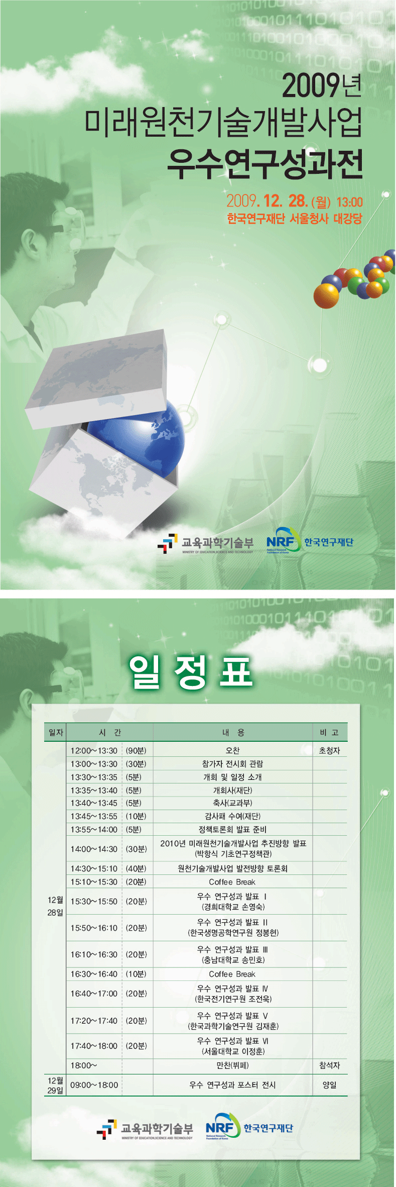 교육과학기술부와 한국연구재단에서는 아래와 같이 2009년 미래원천기술개발사업 우수 연구성과전을 개최합니다.
