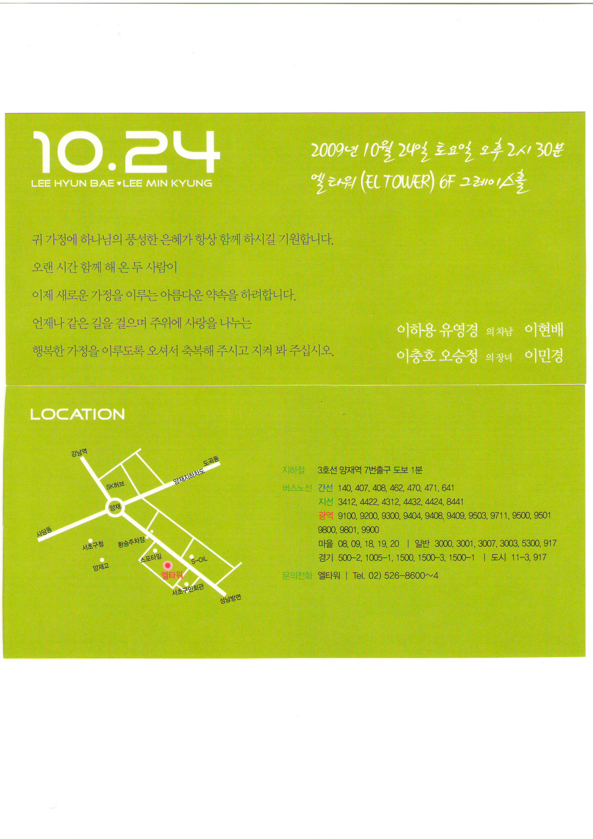 축하합니다.(주)알지오이엔씨 이충호 사장님의 장녀 결혼식이 아래와 같이 있습니다. - 아 래 - 일시 : 2009년 10월 24일(토) 낮 2시 30분장소 : 엘타워 6층 그레이스홀* 첨부 : 청첩장