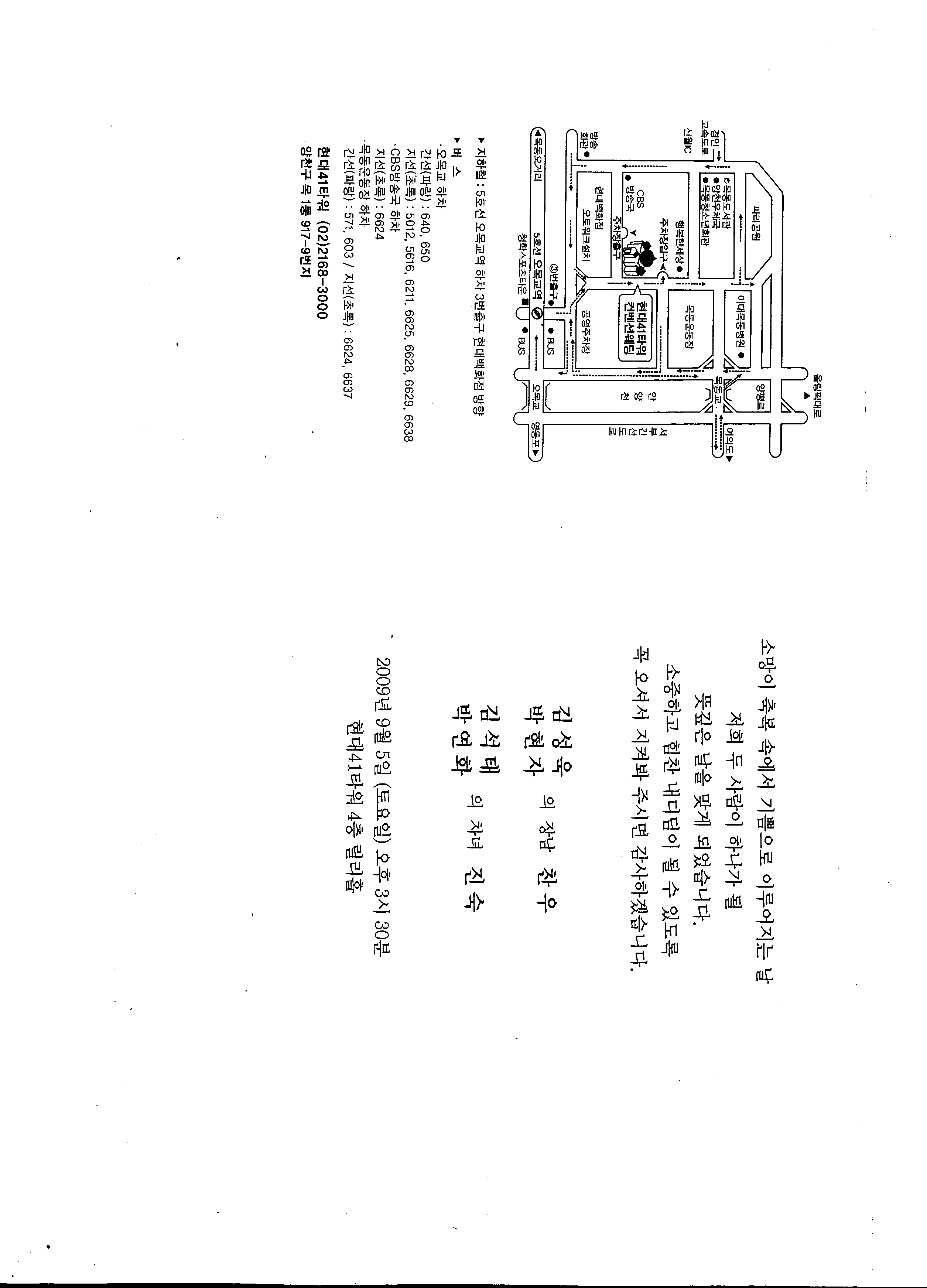 (주)바이텍코리아 대표이사 김성욱 회원님의 장남 결혼식이 아래와 같이 있습니다. - 아 래 - 일시 : 2009년 9월 5일(토) 낮 3시 30분장소 : 현대41타워 4층 릴리홀* 자세한 내용은 첨부파일 참조