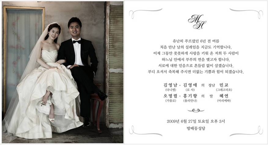 라온이엔지 회장 오명렬의 자녀가 아래와 같이 결혼하게 되었습니다. 오셔서 축하해 주시면 감사하겠습니다. - 아래 -일시:06월27일 오후 3시 장소:서초구 방배동 방배성당 (문의 :02-584-9731) * 첨부 파일 : 청첩장 참조