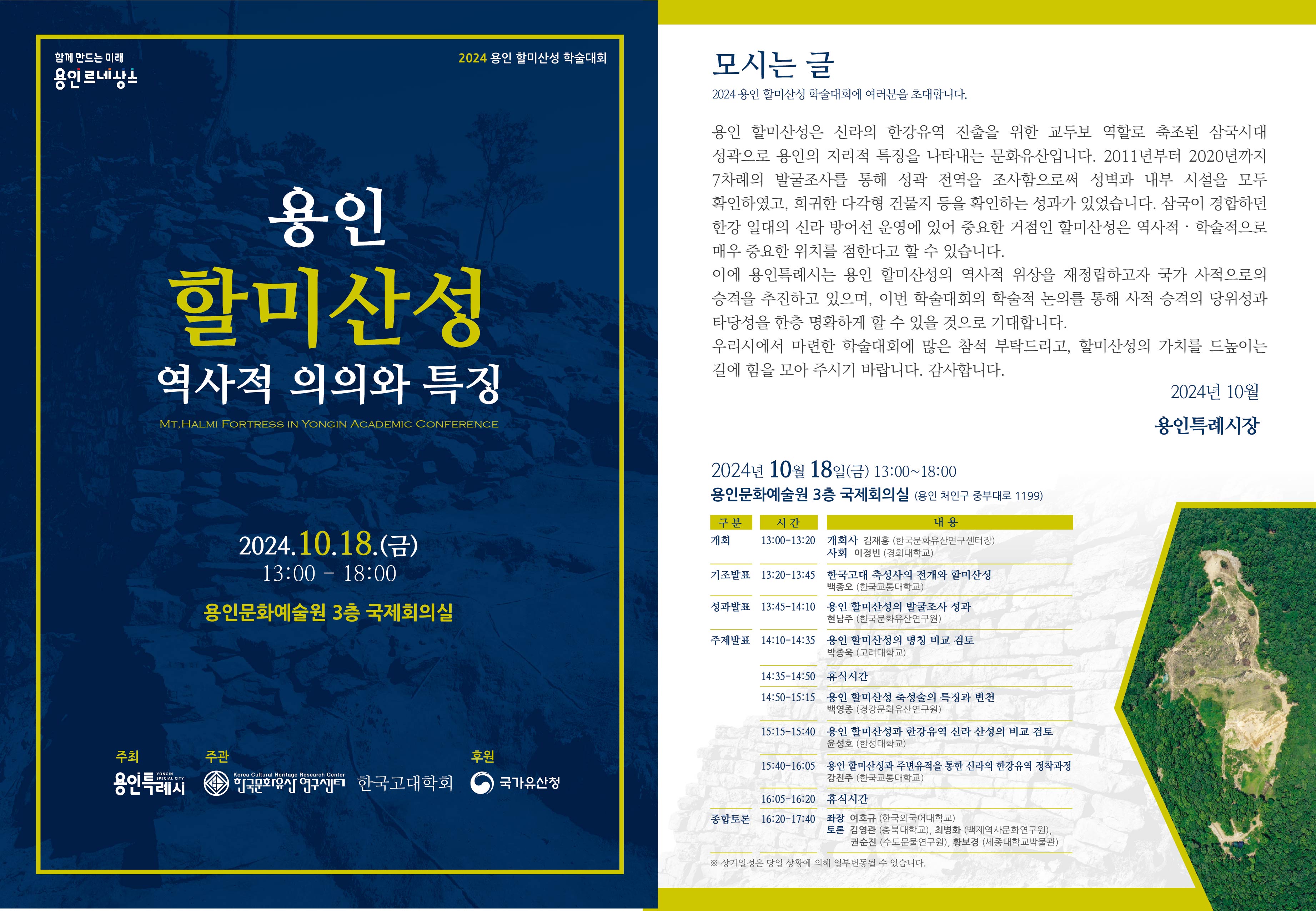 다가오는 2024년 10월 18()에 한국고대학회에서<2024 용인 할미산성 학술대회 용인 할미산성의 역사적 의의와 특징>을 개최하고자 합니다.