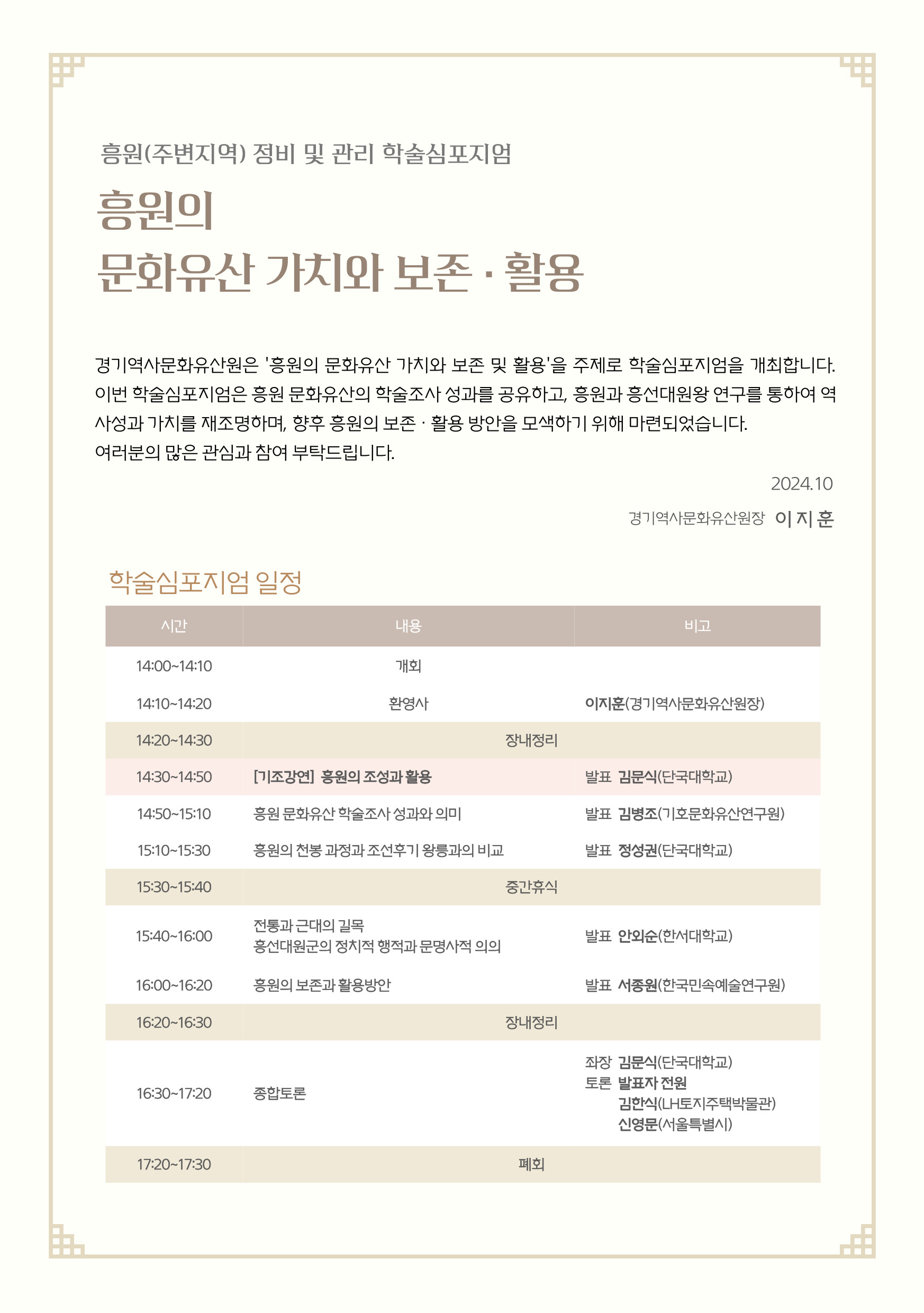 이번 학술심포지엄은 흥원 문화유산의 학술조사 성과를 공유하고흥원과 흥선대원왕 연구를 통하여 역사성과 가치를 재조명하며,