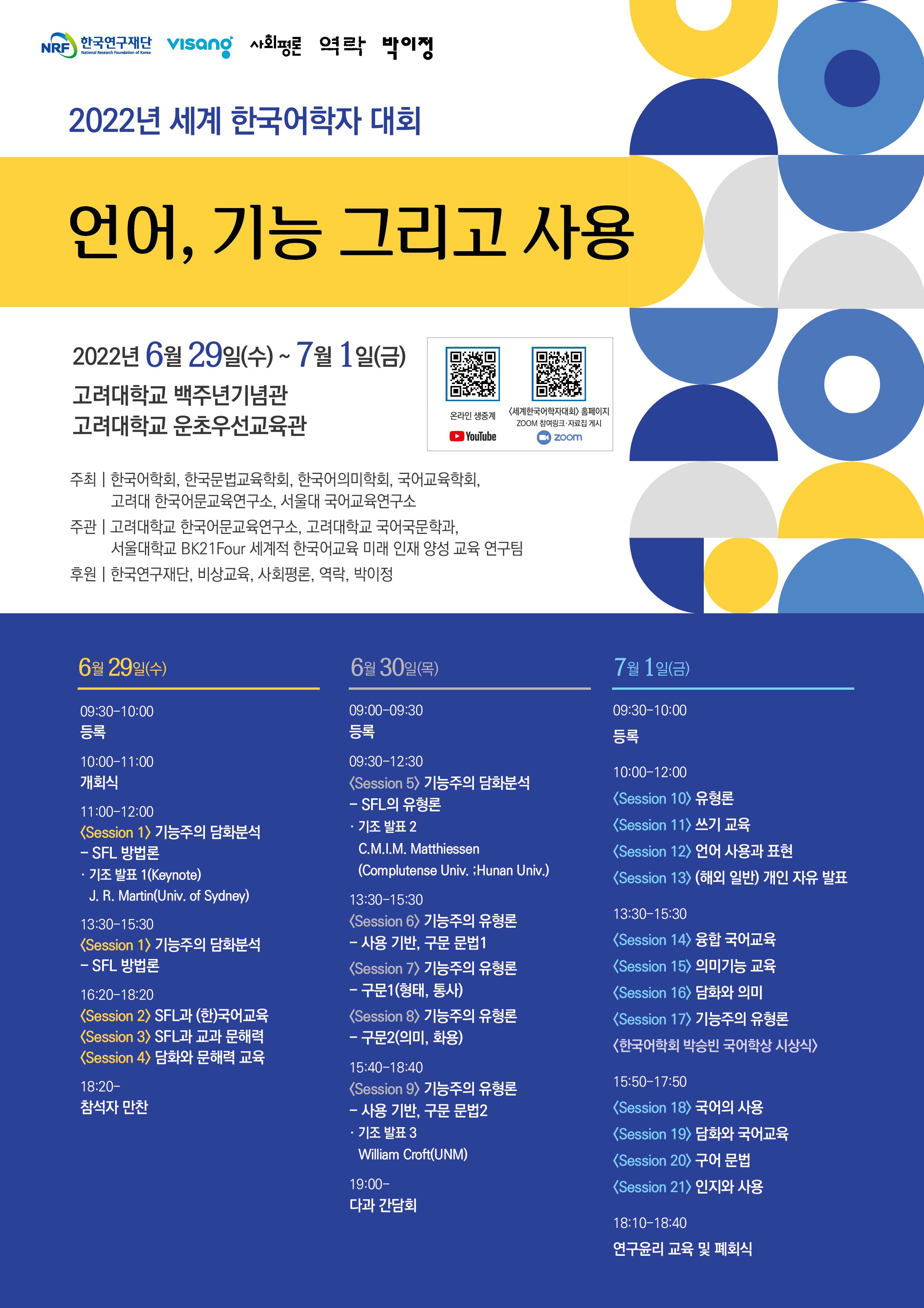 2022 세계 한국어학자 대회가 고려대학교에서 6월 29일(수)부터 7월 1일(금)까지 예정되어 있습니다.