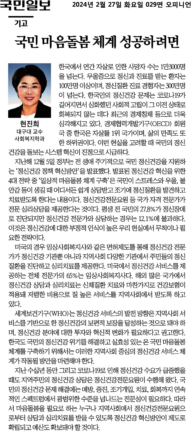 [한국정신건강사회복지학회] 현진희 교수님 국민일보 기고 '국민 마음돌봄 체계 성공하려면'