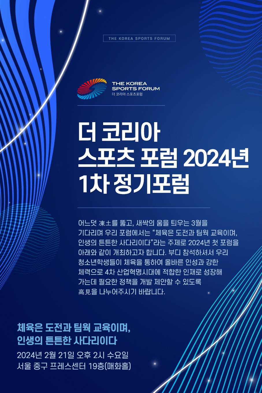 서울 중구 프레스센터 19층(매화홀)에서 더 코리아 스포츠 포럼 2024년 1차 정기포럼이 개최됩니다.