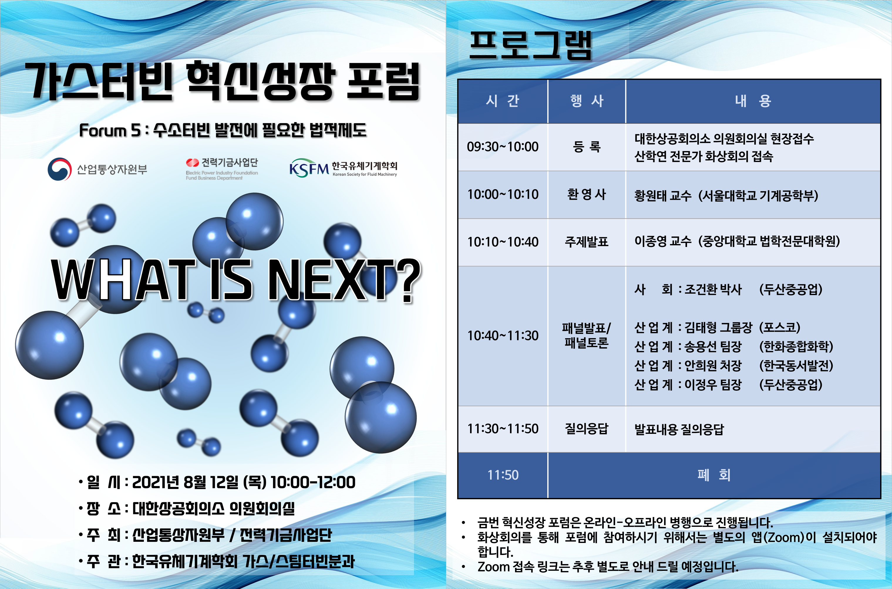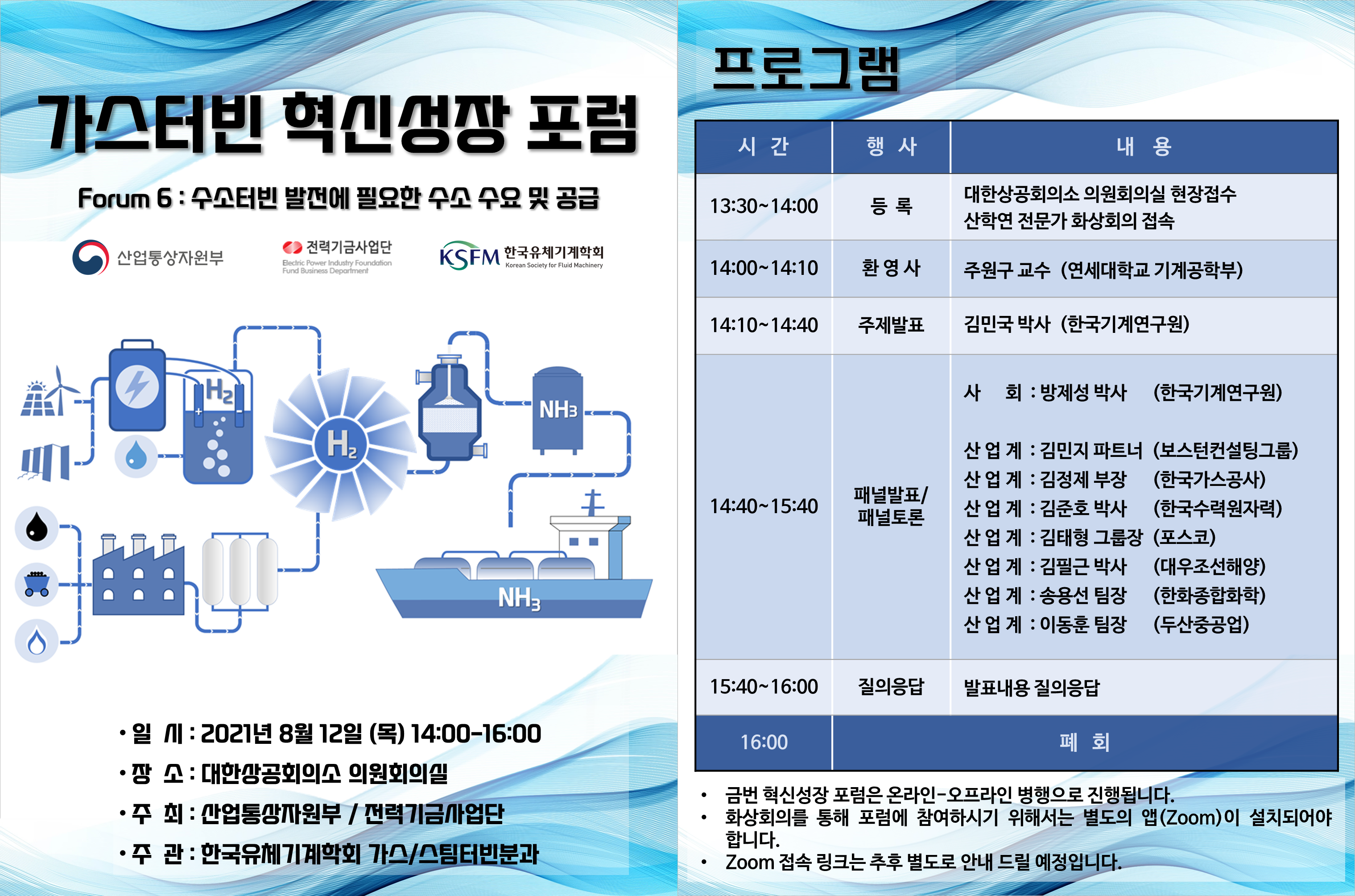 해당 사업의 일환으로 다섯 번째 행사인 ‘수소터빈 발전에 필요한 법적제도’ 포럼 및 여섯 번째 행사인 ‘수소터빈 발전에 필요한 수소 수요 및 공급’ 포럼이 아래와 같이 진행 예정입니다.