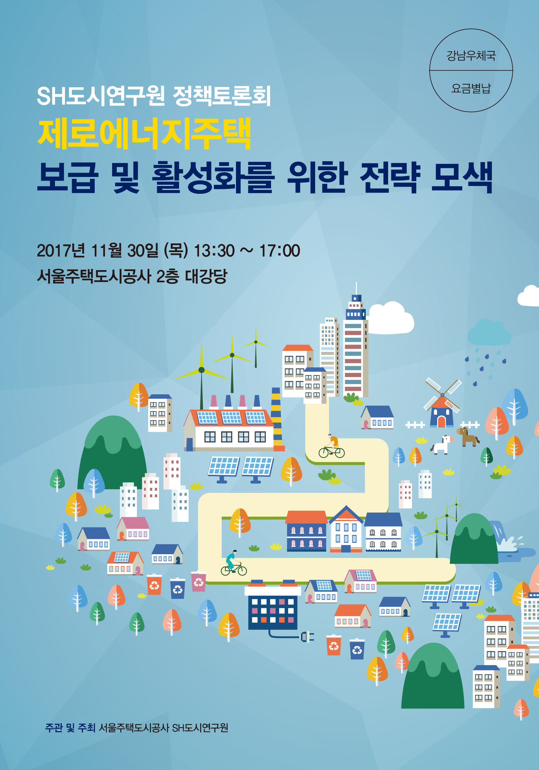 SH서울주택도시공사에서 '제로에너지주택 보급 및 활성화를 위한 전략 모색' 을 주제로 국토교통부 및 서울시 정책동향, 국토교통부 R&D 첫 시범단지인 노원 제로에너지주택단지 시공사례, 서울주택도시공사 제로에너지주택 공급계획 등 현 시점에 있어 중요한 강연들과 산학연 관련 전문가들이 함께하는 토론의 장이 2017년 11월 30일(목) 13:30에 개최되오니 회원 여러분의 많은 참여와 관심 부탁드리겠습니다.