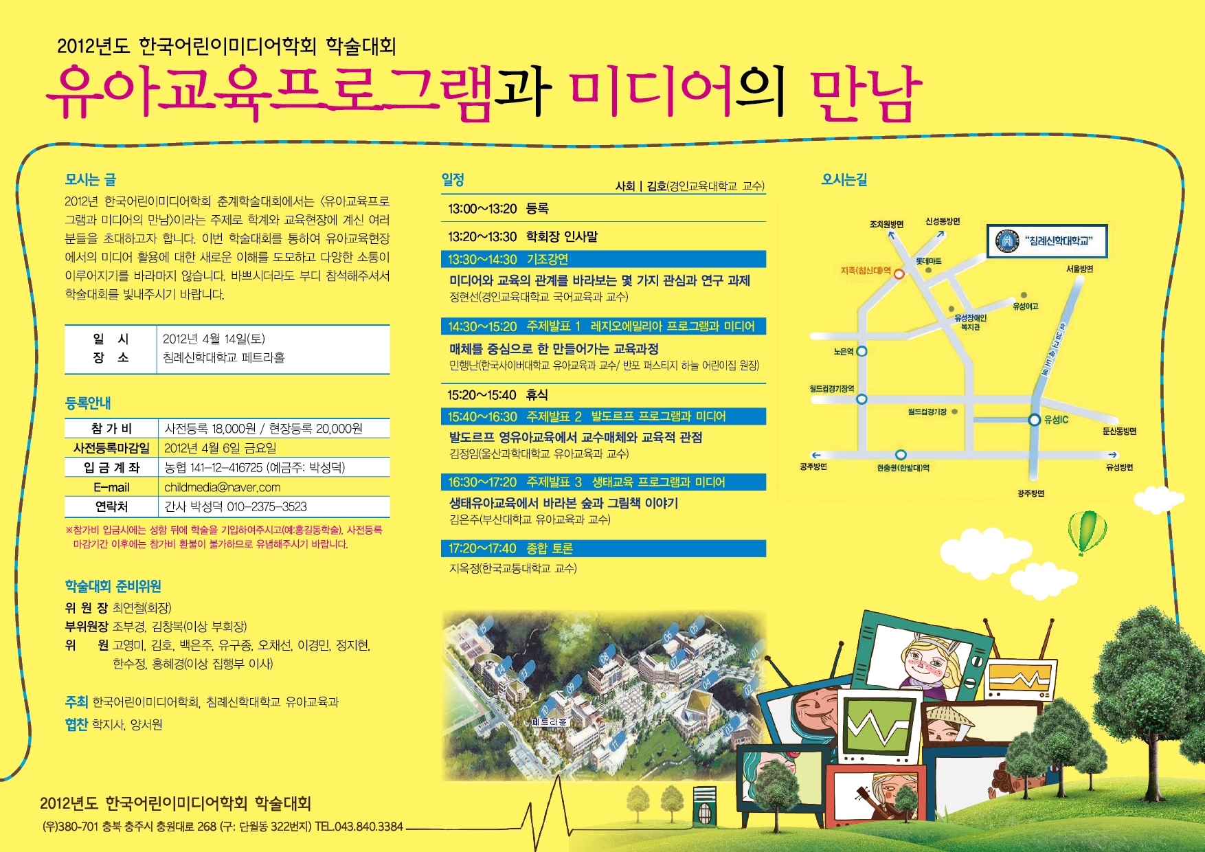 4월 14일(토)에 개최되는 한국어린이미디어학회 2012년 학술대회를 안내드리고자 합니다. 한국어린이미디어학회에서는 '유아교육 프로그램과 미디어의 만남'이라는 주제로 학계와 교육현장에 계신 여러분을 초대하고자 합니다.