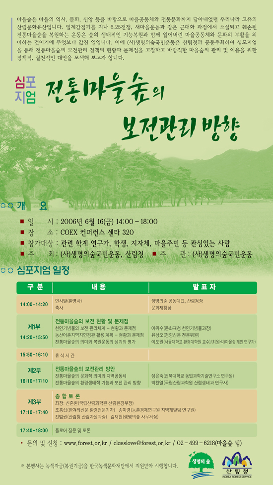 | 「전통마을숲의 보전관리 방향」 심포지엄에 초대합니다. 2004년부터 실시해온 전통마을숲 복원 운동은 숲의 생태적 기능복원과 마을 공동체의 회복, 전통문화의 부활과 계승을 의미하는 일이기에 무엇보다 값진 일입니다. 이에 (사)생명의숲국민운동은 산림청과 공동주최하여 심포지엄을 통해 전통마을숲의 보존관리 정책의 현황과 문제점을 고찰하고 바람직한 마을수의 관리 및 이용을 위한 정책적, 실천적인 대안을 모색해 보고자 합니다. 전통 마을숲을 관리하고 보전하기 위한 바람직한 방향이 논의될 수 있도록 많은 관심과 참석을 부탁드립니다. ■ 일 시 : 2005년 6월 16(금) 14:00 - 18:00 ■ 장 소 : COEX 컨퍼런스 센타 320 ■ 참가대상 : 마을숲 관련 연구기관 및 학계 연구자, 학생, 지자체 공무원, 환경단체, 지역주민 등 관심 있는 모든 사람. ■ 주최 및 주관 : (사)생명의숲국민운동, 산림청 ■ 후 원 : 녹색자금 ■ 사회 : 이수용 생명의숲 마을숲위원장 ■ 좌장 : 신준환(산림과학원 산림환경부장) ■ 문의 : 02-499-6218(마을숲팀) / www.forest.or.kr |