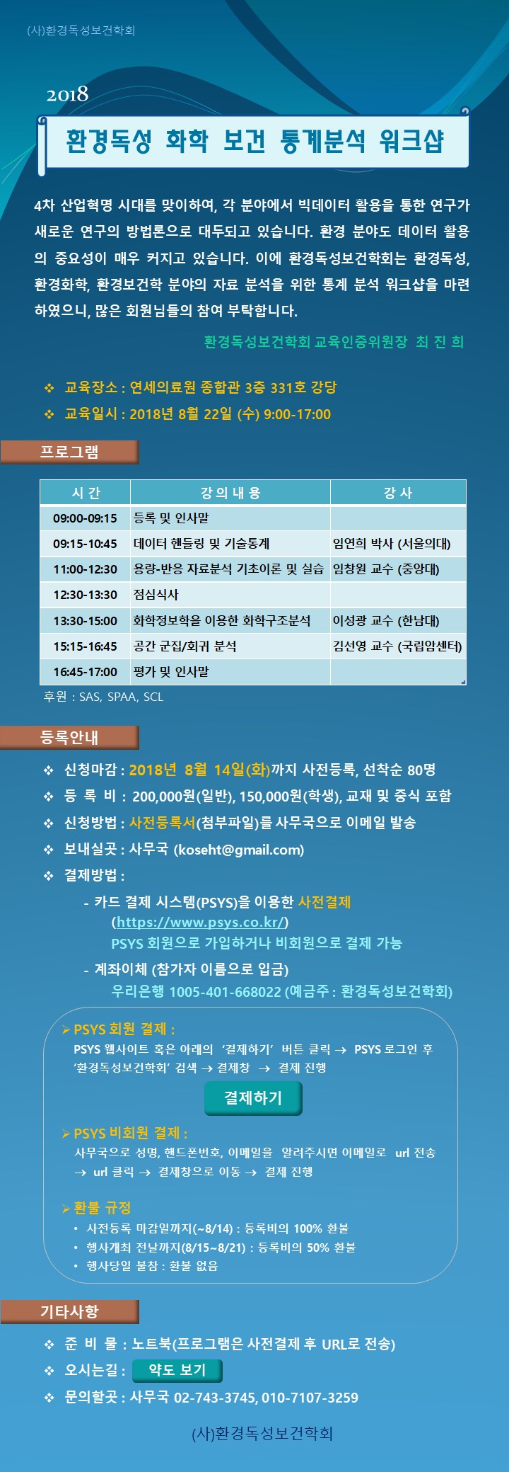2018 환경독성 화학 보건 통계 분석 워크샵 개최(8/22) 상세안내