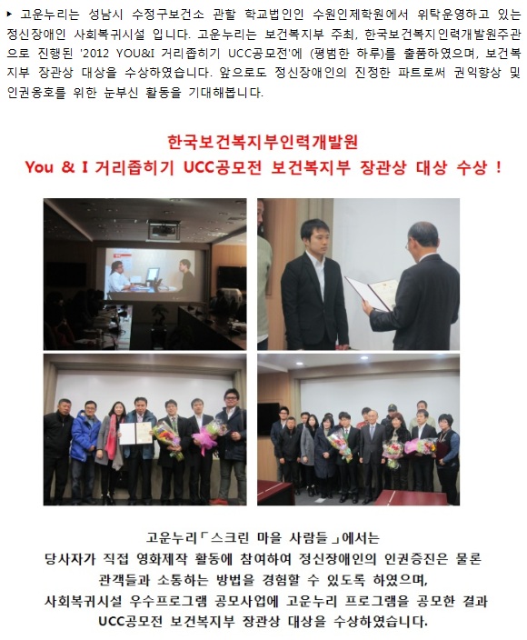 (고운누리)You&I거리좁히기 UCC공모전 보건복지부 장관상 대상 수상