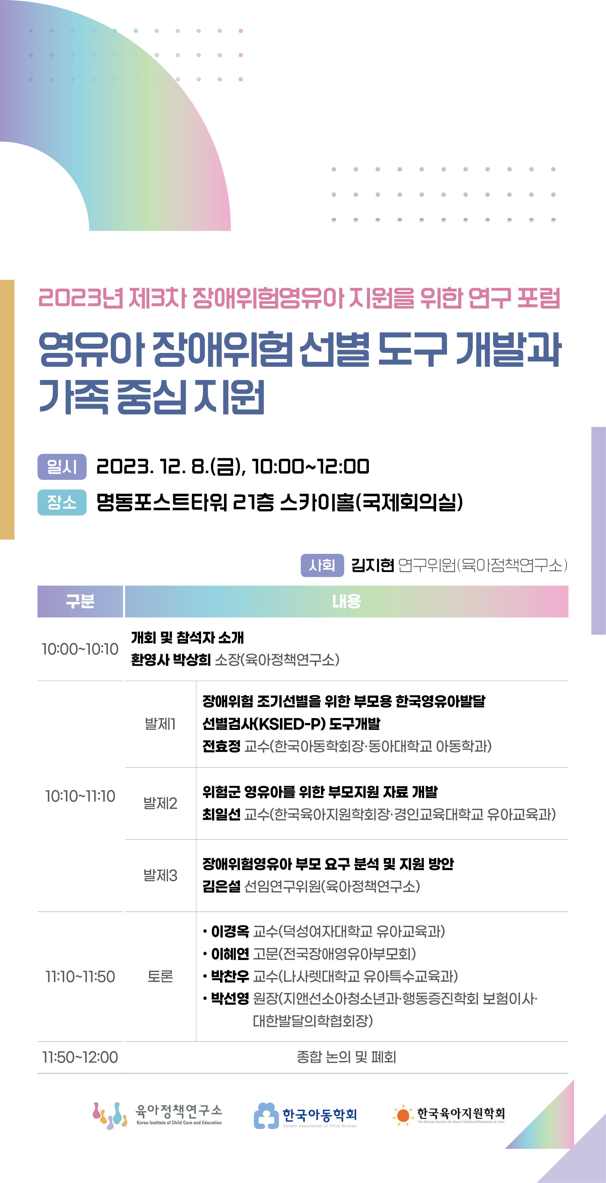 육아정책연구소에서  제3회 장애위험영유아 지원을 위한 연구 포럼을 개최합니다.
