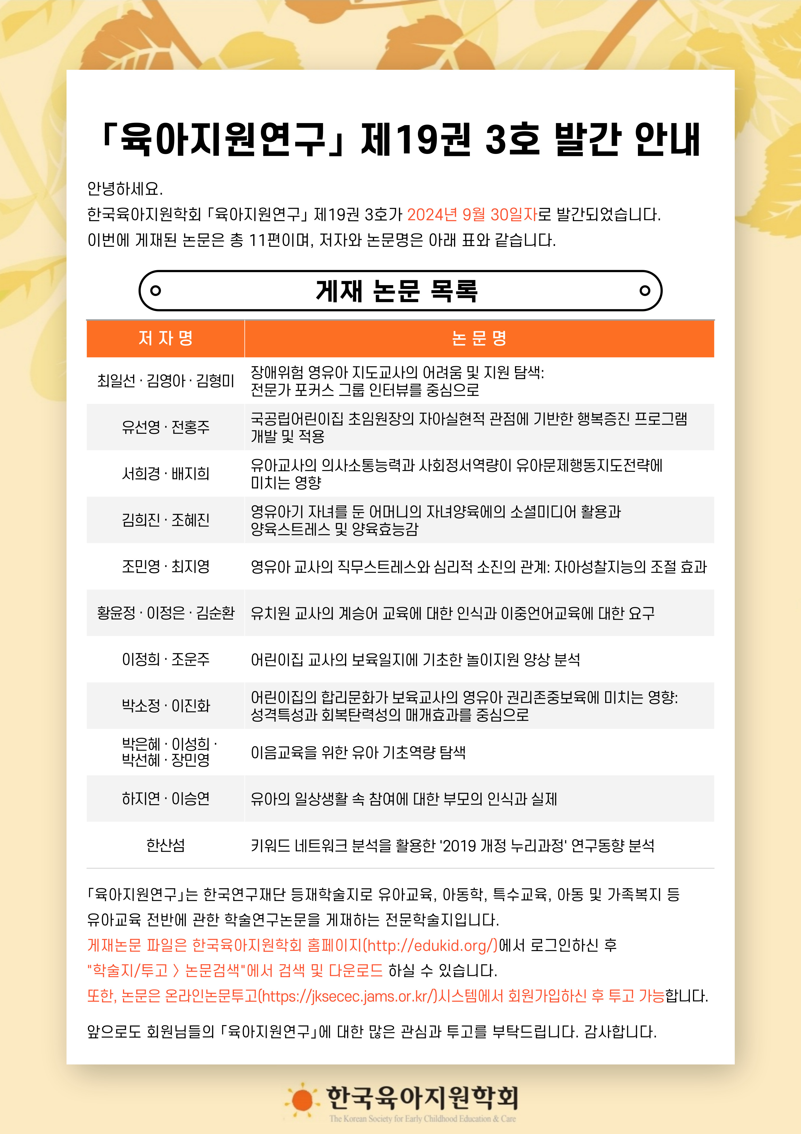 한국육아지원학회 「육아지원연구」제19권 3호가 2024년 9월 30일자로 발간(게재논문 11편)되었습니다.