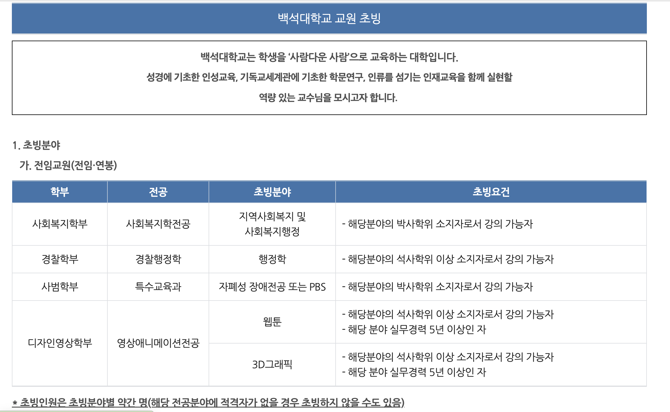 -백석대학교 교원 초빙 안내: https://www.bu.ac.kr/web/3483/subview.do?enc=Zm5jdDF8QEB8JTJGbWFpbk5vdGljZSUyRndlYiUyRjQ0MzkwJTJGYXJ0Y2xWaWV3LmRvJTNG
