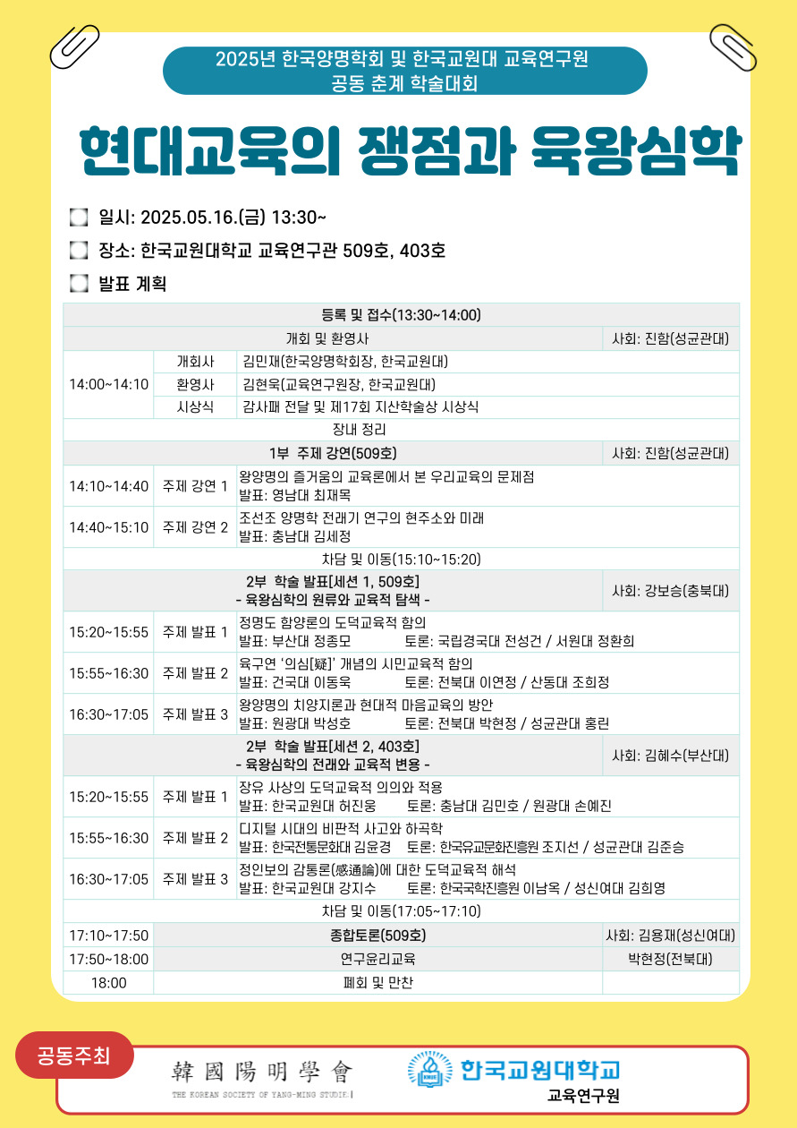 한국양명학회에서는 2025년도 춘계학술대회를 한국교원대학교 교육연구원과 공동으로 진행하고자 합니다.