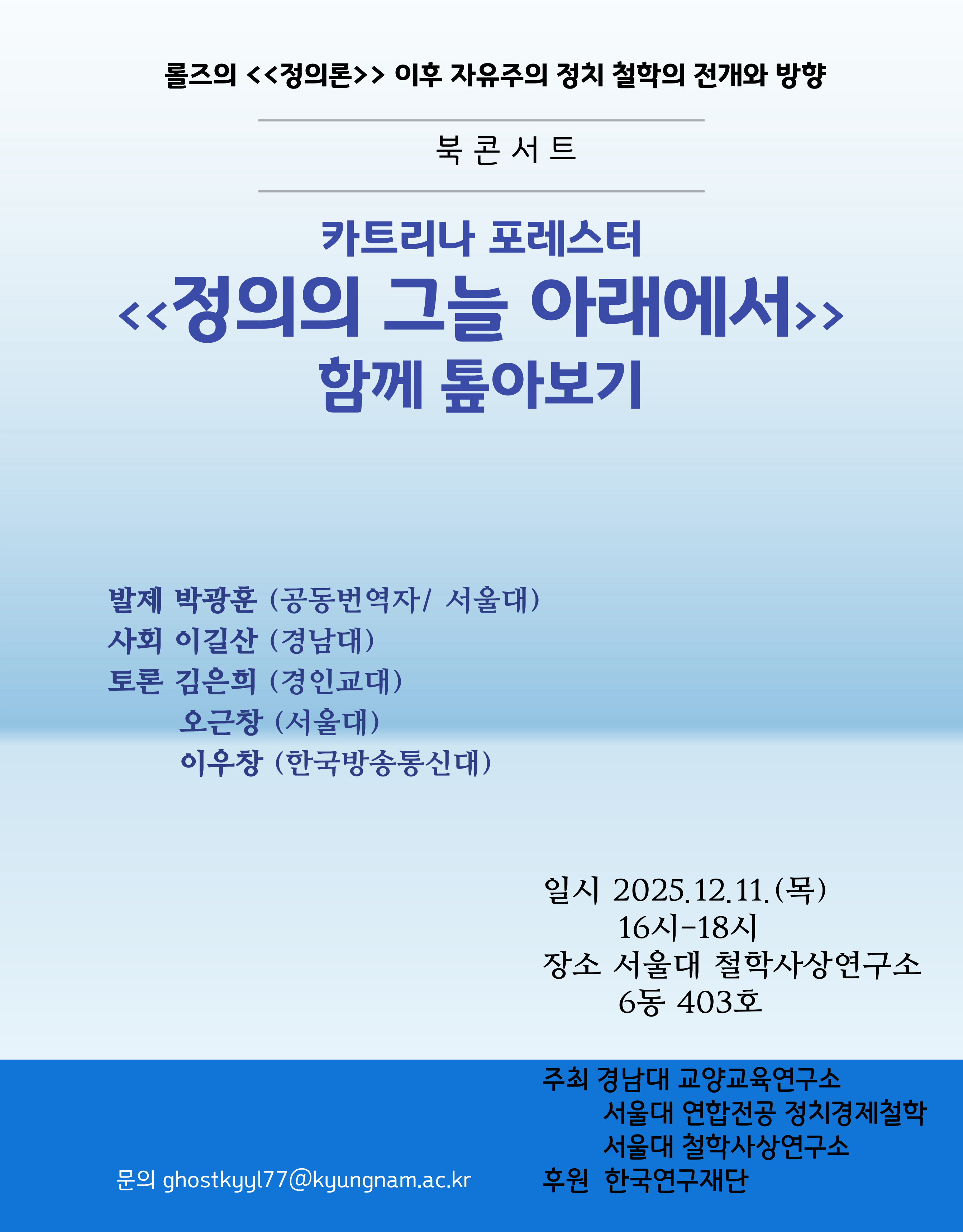 서울대학교 철학사상연구소와 경남대학교 교양교육연구소, 그리고 연합전공 정치경제철학이 공동으로 마련한 이번 세미나에서는 공역자 가운데 한 사람인 박광훈 선생님의 발제를 시작으로 김은희(경인교대)), 오근창(서울대), 이우창(방송통신선생님이 각자의 문제의식에서 포레스터의 논의를 비판적으로 검토합니다이어 1시간 동안 종합 토론을 진행하며 롤즈의 그늘에서 사유되는 오늘의 정치철학과 지성사 연구의 방향을 함께 모색하고자 합니다본 행사는 참가자 전원이 정의의 그늘 아래에서를 숙지하였다는 전제하에 진행됩니다.