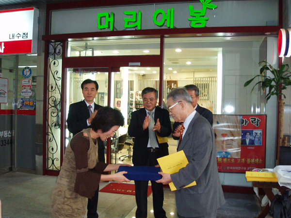 2005년 9월 28일 (수) 오후 5시부터 서울 종로구 내수동 경희궁의 아침 3단지 상가에 있는 '머리에봄'(원장 김미선)에서 2005년 세 번째 아름다운 우리말 가게이름 행사를 하고 있는 모습입니다. 사진은, 한글 학회 김계곤 회장이 머리에봄 김미선 원장(왼쪽, 패 받는 이)에게 '아름다운 우리말 가게이름' 패를 전달하고 있는 모습입니다. <찍은 이: 꿈돌이, 2005년 9월 28일.>