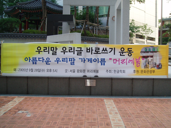 2005년 9월 28일 (수) 오후 5시부터 서울 종로구 내수동 경희궁의 아침 3단지 상가에 있는 '머리에봄'(원장 김미선)에서 2005년 세 번째 아름다운 우리말 가게이름 행사를 하였습니다. 이 그림은 이 날 가게 마당에 걸어 놓은 현수막입니다. <찍은 이: 꿈돌이, 2005년 9월 28일.>