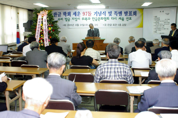 2005년 8월 31일 (수) 오후 3시부터 한글 회관 강당에서 있은 한글 학회 세운 97돌 기념 잔치의 한 모습입니다. 이 그림은 한글 학회 김 계곤 회장의 인사말씀 중에 앞으로 있을 100돌 기념 사업의 내용을 청중 앞에 선포하고 있는 모습입니다. <찍은 이: 참말로, 2005년 8월 31일.>