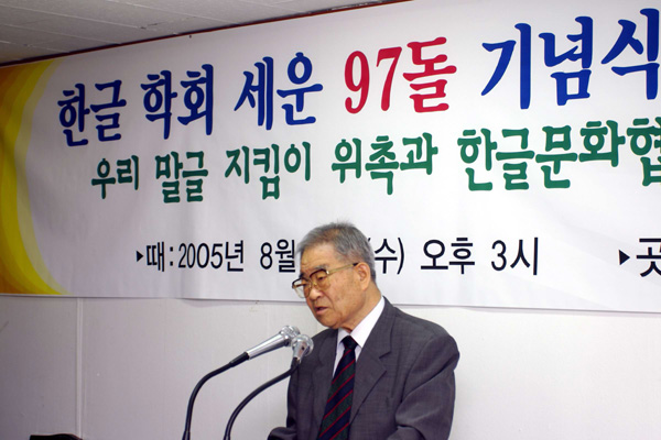 2005년 8월 31일 (수) 오후 3시부터 한글 회관 강당에서 있은 한글 학회 세운 97돌 기념 잔치의 한 모습입니다. 이 그림은 한글 학회 김 계곤 회장께서 인사말씀을 하고 있는 모습입니다. <찍은 이: 참말로, 2005년 8월 31일.>