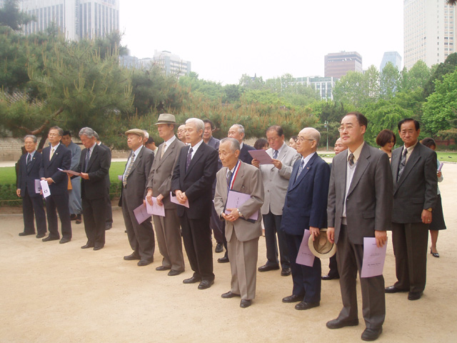 2005년 5월 14일 (토) 오전 9시부터 덕수궁 세종대왕 동상 앞에서 있은 '608돌 세종날 기념 꽃바치기 모임'을 갖고나서 참석자들과 함께 2005년 첫 번째 우리 말글 지킴이(권혁채, 전직교사) 위촉식을 가졌는데, 이 날 모인 한글문화단체 단체장과 회원들의 모습입니다. <찍은 이: 꿈돌이, 2005년 5월 14일.>