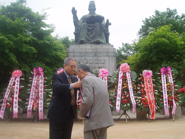 2005년 5월 14일 (토) 오전 9시부터 덕수궁 세종대왕 동상 앞에서 있은 '608돌 세종날 기념 꽃바치기 모임'을 갖고나서 참석자들과 함께 2005년 첫 번째 우리 말글 지킴이(권혁채, 전직교사) 위촉식을 가졌는데, 이 날 한글학회 김계곤 회장이 지킴이에게 기념메달을 걸어 주는 모습입니다. <찍은 이: 꿈돌이, 2005년 5월 14일.>
