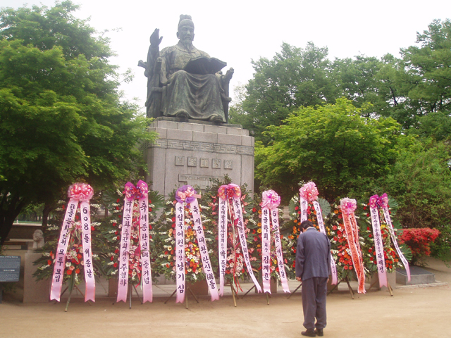 2005년 5월 14일 (토) 오전 9시부터 덕수궁 세종대왕 동상 앞에서 있은 '608돌 세종날 기념 꽃바치기 모임'에서 한글문화단체모두모임 이상보 회장을 대신하여 이대로 사무총장이 꽃을 바치고 나서 묵념하고 있는 모습입니다. <찍은 이: 꿈돌이, 2005년 5월 14일.>