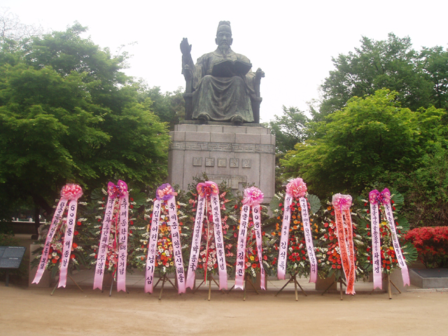 2005년 5월 14일 (토) 오전 9시부터 덕수궁 세종대왕 동상 앞에서 있은 '608돌 세종날 기념 꽃바치기 모임'에서 여러 한글 관련 단체들에서 세종대왕 동상 앞에 꽃바쳐 놓은 모습입니다. <찍은 이: 꿈돌이, 2005년 5월 14일.>