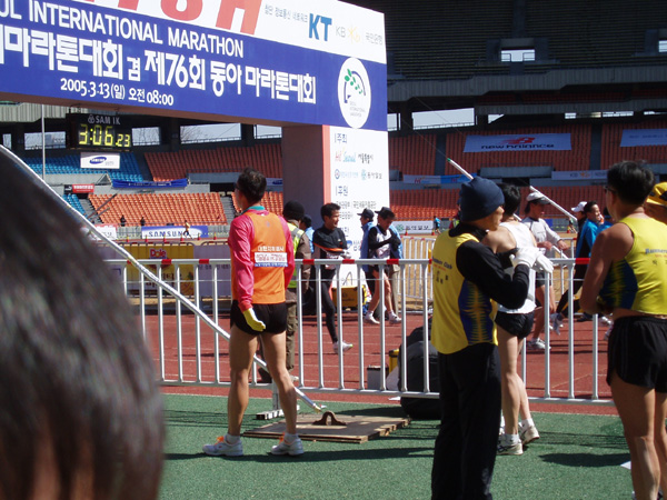 2005년 3월 13일 (일) 아침, '2005서울국제마라톤대회 겸 제76회동아마라톤대회에서 등에 '한글날을 국경일로' 등판 딱지를 붙이고 출발지인 세종로에서 결승점인 잠실종합운동장까지 42.195㎞를 완주한 참가 선수들의 모습. 이 날 한글날국경일제정범국민추진위원회가 주최하고 한글학회, 세종대왕기념사업회, 외솔회, 한글인터넷주소총연합회가 후원하여 이 마라톤 대회에서 한글날 국경일 제정 추진을 위한 홍보 운동을 하였다. 새벽부터 한글 학회 직원들과 관련 단체 회원들, 김제에서 마라톤 대회에 참가하기 위해 올라 온 정 갑주 할아버지 외 20여 명 등 한글 사랑을 실천하는 이들은, 출발지인 세종로 세종문화회관 앞에서 마라톤 대회에 참가한 선수들의 등에 '한글날을 국경일로!'(가로 27.5×8.5㎝)라고 세긴 등판 딱지(스티커) 5,000장을 붙여 주거나 나누어 주었다. (찍은 이: 꿈돌이, 20050313.)