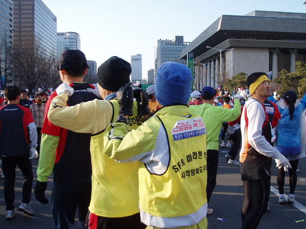 2005년 3월 13일 (일) 아침, '2005서울국제마라톤대회 겸 제76회동아마라톤대회 출발지인 세종로(세종문화회관 앞)에서 참가 선수들이 출발을 기다리며 몸을 풀고 있는 모습. 이 날 한글날국경일제정범국민추진위원회가 주최하고 한글학회, 세종대왕기념사업회, 외솔회, 한글인터넷주소총연합회가 후원하여 이 마라톤 대회에서 한글날 국경일 제정 추진을 위한 홍보 운동을 하였다. 새벽부터 한글 학회 직원들과 관련 단체 회원들, 김제에서 마라톤 대회에 참가하기 위해 올라 온 정 갑주 할아버지 외 20여 명 등 한글 사랑을 실천하는 이들은, 마라톤 대회에 참가한 선수들의 등에 '한글날을 국경일로!'(가로 27.5×8.5㎝)라고 세긴 등판 딱지(스티커) 5,000장을 붙여 주거나 나누어 주었다. (찍은 이: 꿈돌이, 20050313.)