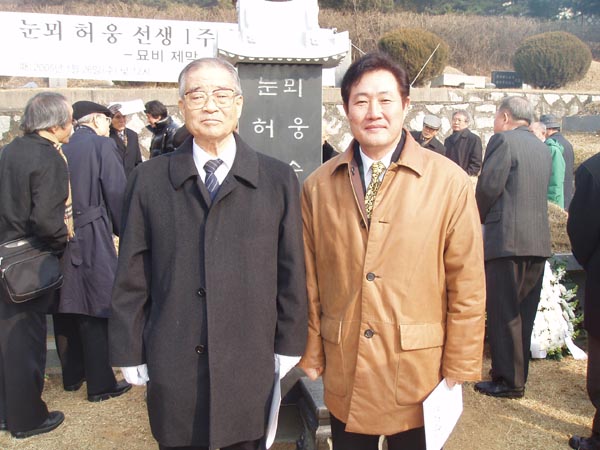 2005년 1월 26일 (수)에 모란공원 안 눈뫼 스승 무덤터(경기도 남양주시 화도읍 월산리)에 새로 세운 묘비 앞에서 한글 학회 김 계곤 회장과 중국 상해외대 강 효성 교수. (찍은 이: 꿈돌이, 20050126.)