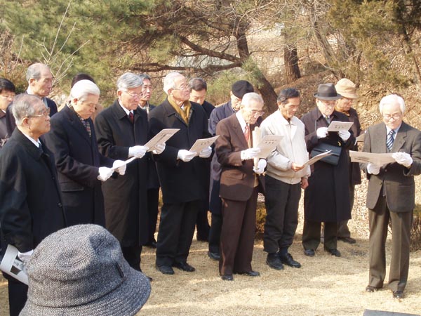 2005년 1월 26일 (수)에 모란공원 안 눈뫼 스승 무덤터(경기도 남양주시 화도읍 월산리)에서 가진 1주기 추모식의 한 모습. 한글 학회 김 석득 부회장이 눈뫼 허 웅 선생의 해적이를 낭독하는 모습. (찍은 이: 꿈돌이, 20050126.)