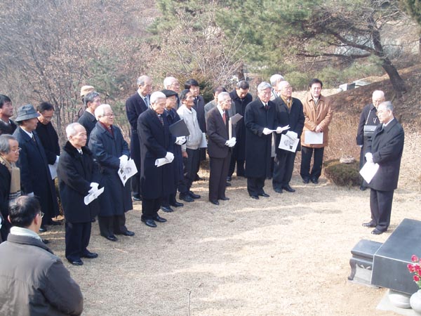 2005년 1월 26일 (수)에 모란공원 안 눈뫼 스승 무덤터(경기도 남양주시 화도읍 월산리)에서 가진 1주기 추모식의 한 모습. 이 날 묘비 제막을 앞두고 눈뫼 허 웅 선생 추모 사업 준비위원회 김 계곤 위원장(한글 학회 회장)이 인사 말씀을 하고 있다. (찍은 이: 꿈돌이, 20050126.)