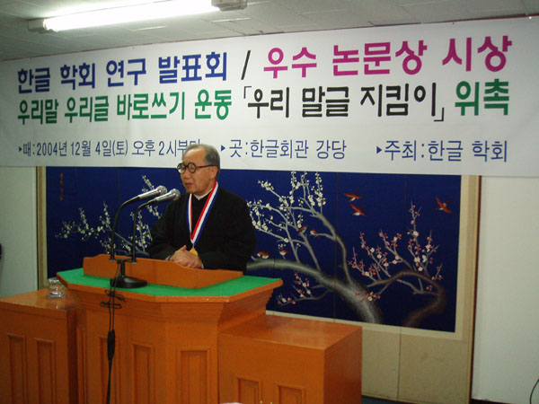2004년 12월 4일, 한글 회관 5층 강당에서 2004년 다섯 번째 '우리 말글 지킴이'로 위촉을 받은 고양문화재단 이 상만 총감독이 다짐의 말씀을 하고 있는 모습.