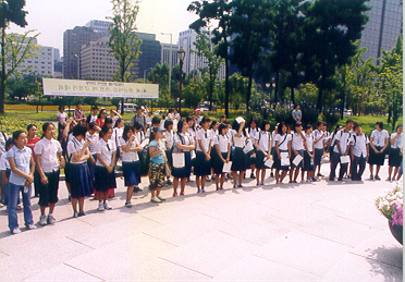 제1회 한글이름 가진이 글짓기 대회(2004. 9. 4.)의 한 모습입니다. 참가한 이들이 여의도 공원 세종대왕 동상 앞에 모여 글짓기 대회에 관한 설명을 듣고 있습니다.