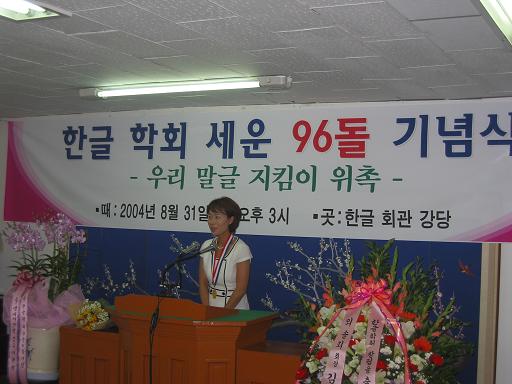 2004년 세 번째 우리 말글 지킴이로 뽑힌 진주문화방송 박 인숙 아나운서가 지킴이 위촉패를 받은 뒤 소감을 말하고 있는 모습. <사진: 이 대로>