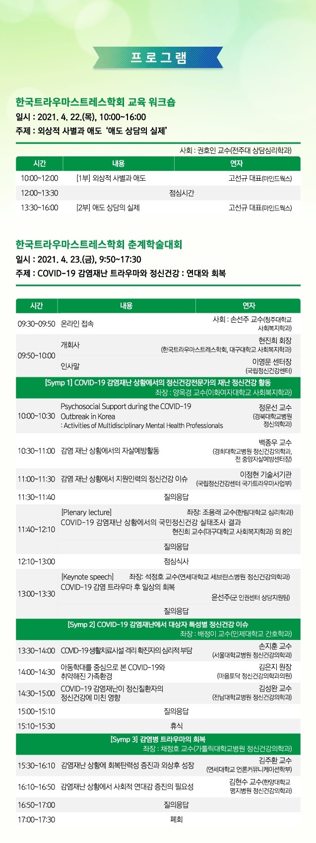 한국트라우마스트레스학회에서는 4/22(목)~4/23(금) 춘계학술대회를 개최한다고 합니다.