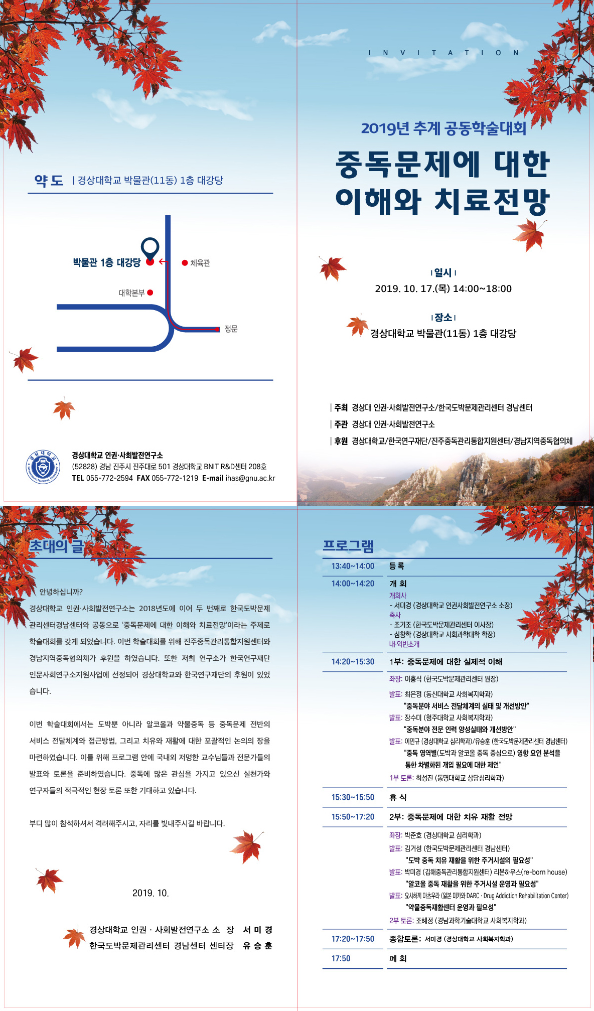 한국도박문제관리센터 경남센터와 경상대학교 인권사회발전연구소는 2019 추계공동학술대회를 개최합니다. 이번 학술대회는 중독문제에 대한 서비스 전달체계와 치유재활에 대한 포괄적인 논의의 장을 마련하고자 합니다. 많은 관심과 참여 바랍니다.