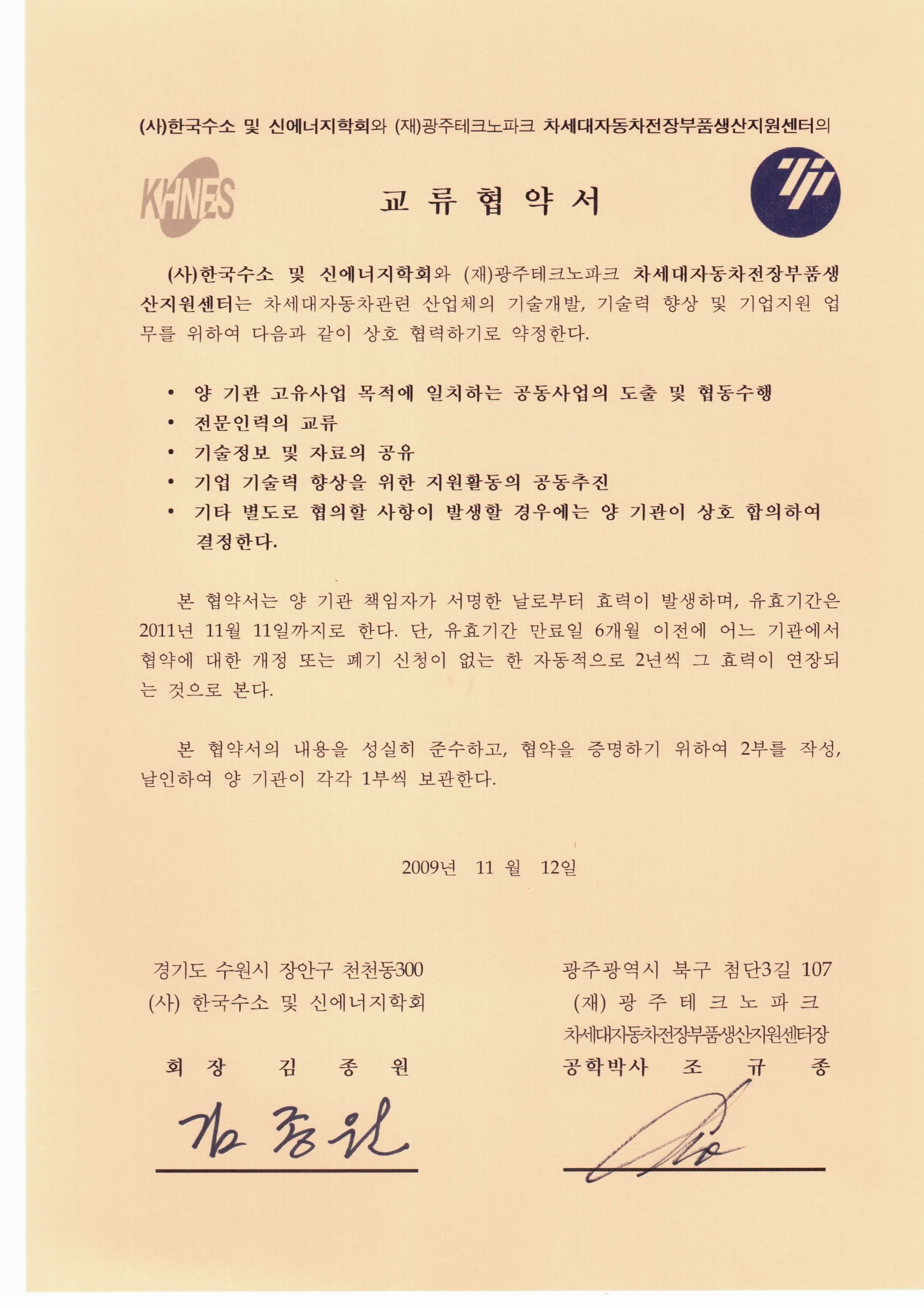 (사)한국수소 및 신에너지학회는와 (재)광주테크노파크 차세대자동차전장부품생산지원센터의 교류협약서
