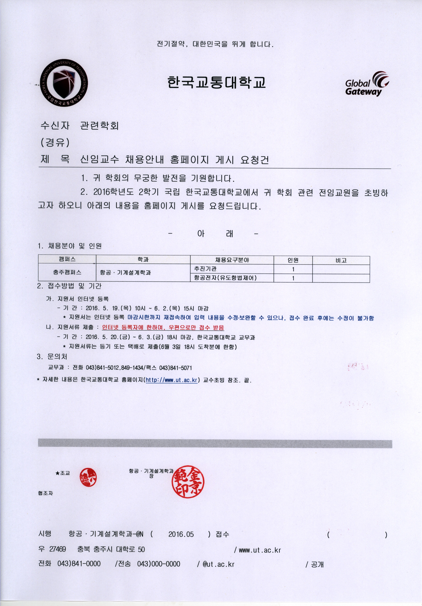한국교통대학교 항공기계설계학과 신임 교수채용 안내