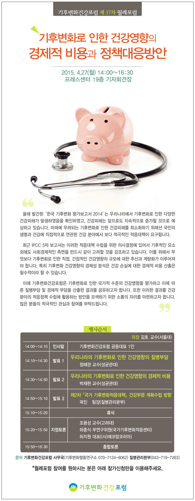 안녕하세요. 기후변화건강포럼에서 <기후변화로 인한 건강영향의 경제적 비용과 정책대응방안>을 주제로 제 37차 월례포럼을 오는 4월 27일(월) 오후 2시~4시 30분에 프레스센터 19층 기자회견장에서 개최합니다. 우리나라에서 기후변화로 인한 건강영향에 따른 질병부담 및 경제적 부담 산출과 이를 건강분야의 적응정책 수립을 위한 활용방안을 모색하는 자리로 마련하고자 합니다. 관심 있는 분들의 많은 참여를 부탁드립니다!